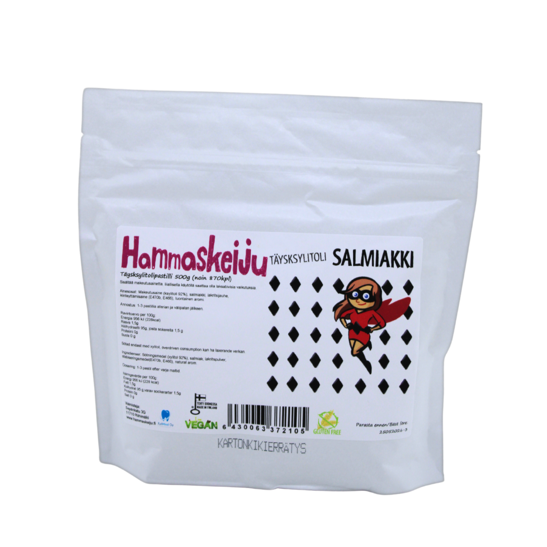 Täysksylitolipastilli Salmiakin ystäville 500 g (n 870 kpl). Jos pidät Salmiakista, et voi olla rakastumatta näihin Hammaskeijuihin.